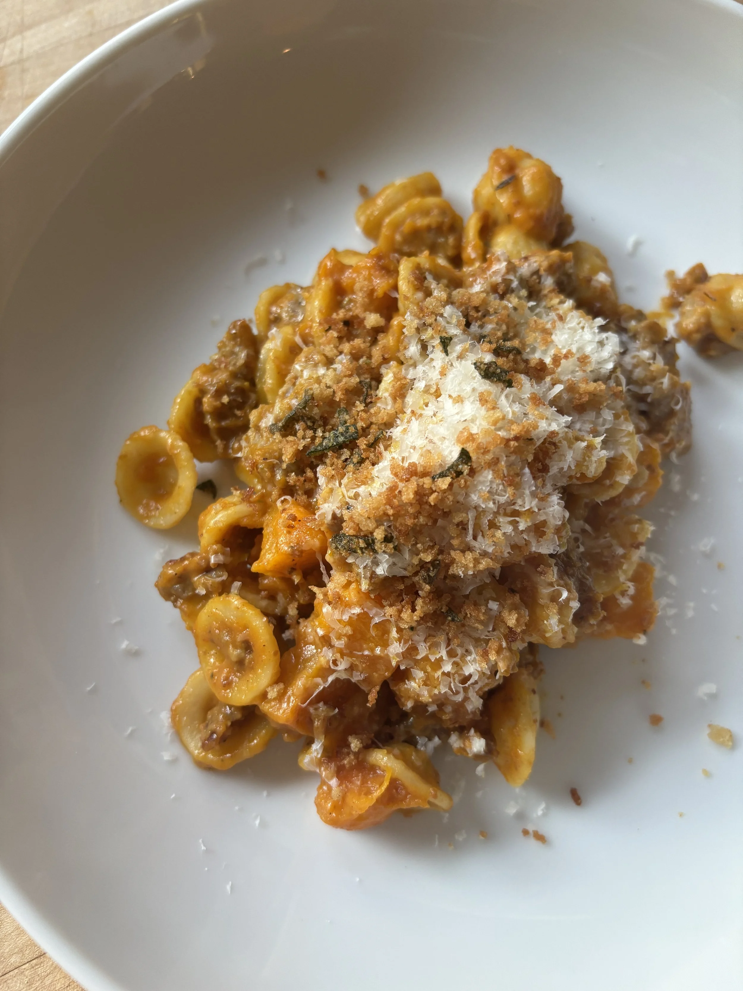 Add 1/2 can pumpkin puree to sausage & continue to cook over medium 2-3 mins. Add thyme. Add cooked pasta. Add reserved pasta water in 1/2 cup increments, stirring frequently until everything is combined - glossy, and saucy.